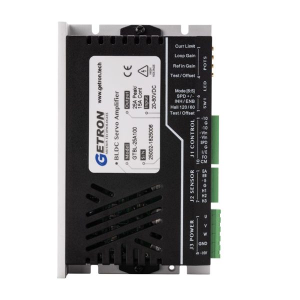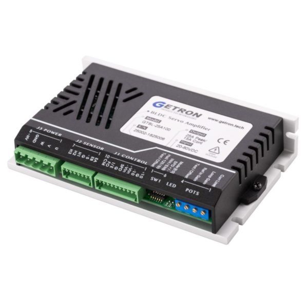 GTBL-E25A100為一款工業用通用型無刷馬達驅動器, 具備優異的控制性能與控制響應速度, 並完整實現電流環與速度環, 適用於速度控制或扭力控制等應用場合. 此驅動器亦具備各種保護電路功能, 包含過電壓, 過電流, 低電壓, 過溫, 短路保護. 驅動器支援 20-80V輸入電壓, 瞬間最大電流為15A, 連續輸出電流為7.5A. 最大輸出為1200W, 適用於 10W-550W之無刷或有刷馬達